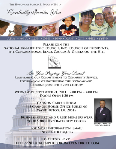 The Honorable Marcia L. Fudge cordially invites you to the 2nd Annual Divine Nine Presidents Panel. Please join the National Pan Hellenic Council, Inc. Council of Presidents, The Congressional Black Caucus and Greeks on the Hill for the “Are You Paying Your Dues, A Discussion on Reaffirming our Committment to Community Service, Focusing on Strengthening the Economy and Creating Jobs in the 21st Century” Black Greek panel, featuring the Council of Presidents.