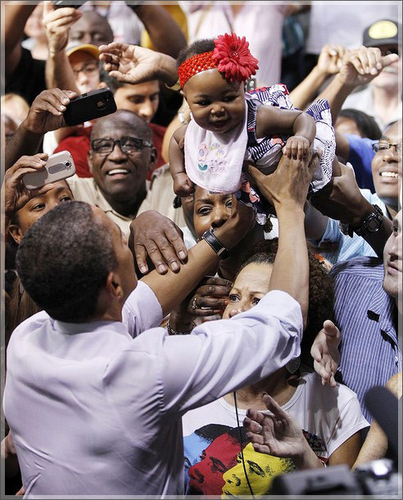 President Barack Obama was spotted at a campaign rally at Rollins College during a campaign stop in Orlando, Florida, today. The president mingled with supporters including five-month-old Kaydence Moore. Obama’s newfound interest in black folk is a departure from his 2008 presidential run, when he pretty much ignored the black community. President Obama is feeling the heat from challenger Romney whose poll numbers are equal to or better than Obama’s. Obama is campaigning in Florida and Northern Virginia today.