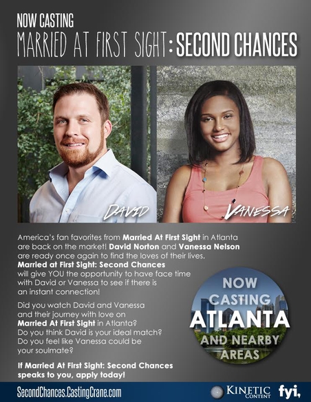 America's fan favorites from Married At First Sight in Atlanta are back on the market! David Norton and Vanessa Nelson are ready once again to find the loves of their lives. Married At First Sight: SECOND CHANCES will you give YOU the opportunity to have face time with David or Vanessa to see if there is an instant connection!