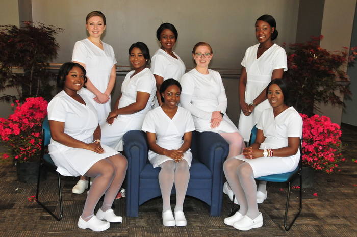 DSC_7945: DSU Department of Nursing’s Class of 2018: (l-r) Alexis Sudler, Idalis Stamas, Breanna Clinton, Jadidah Gatheri (standing), Emmanuella Che (seated), Katherine Groves, Kayla Nelson and Mary Muthini