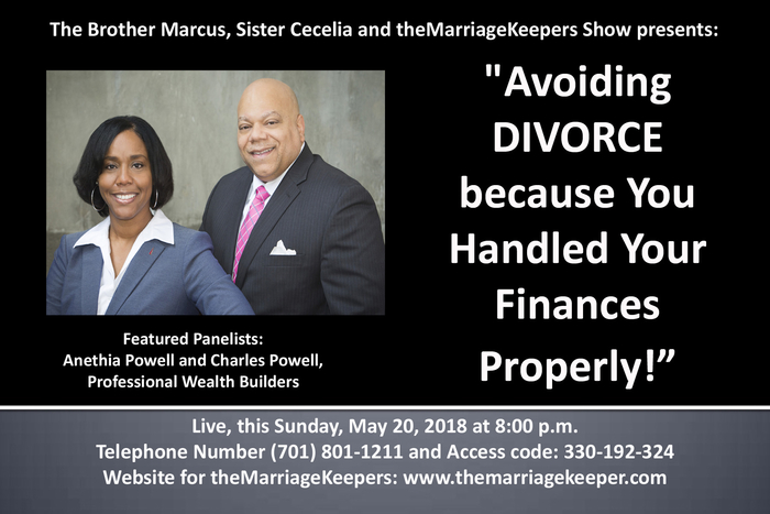 www.facebook.com/events/253959931816924 God willing, this Sunday, May 20, 2018, at 8:00 p.m. EST., please join your Marriage and Relationship Servants, Brother Marcus, Sister Cecelia, and TheMarriageKeepers as we welcome the dynamic team of Anethia Powell and Charles Powell, to the show!! They are professional wealth builders and they are coming on our show to tell us some common sense principles that we need to know. The name of our show will be, "Avoiding divorce because you handled your finances properly!”