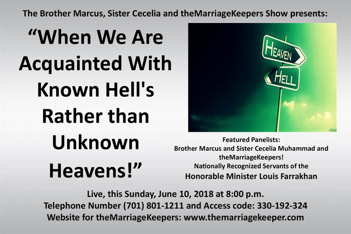 Brother Marcus and Sister Cecelia Muhammad are active, registered believers in the Nation of Islam and attend Muhammad Mosque #15 under the leadership of the Southern Regional Student Representative of the Honorable Minister Louis Farrakhan, Abdul Sharrieff Muhammad. They have been in the process of marriage for the last 25 years. The Brother Marcus and Sister Cecelia Show and theMarriageKeepers Show are one of the only platforms the Nation and our people have to talk seriously about Marriage, Relationships and Properly Parenting our children in 2018. Our shows are exclusively designed for couples in the process of marriage as well as single people who still desire marriage. The purpose of the show is to help both men and women to line their lives up with the standard of God and make His thoughts and ways the centerpiece of our marriages. This particular show represents our 204th Internet Radio Show in service to the Honorable Minister Louis Farrakhan, His National, Regional and Local, Laborers and other concerned Christian Pastors and Preachers. We wish to promote positive and healthy marriages in our communities and to stop the obsession with divorce among our people! We are striving very hard to use God’s airwaves constructively and offering ‘free, online marriage counseling’ that help to aid us all in becoming character filled, valuable final products! We absolutely love to serve and to minister unto you and to learn from you and we strive very hard to specialize in discussions that are worthy of discussion!