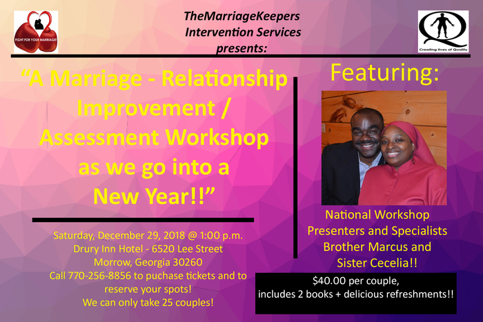 Saturday, December 29, 2018 Marriage – Relationship Improvement Seminar at 1:00 p.m. near Atlanta, Georgia! Come out and show your support for Marriage! We will discuss 2018 and all the successes we had in our marriages and how to improve them going forward. We will also access where we are in our marriages as we prepare to enter into 2019. Every couple will receive 2 books, “What do Men and Woman Really need from Each other?” and “Marriage Tips – Volume 1”. Each couple will also receive a packet of information as well. We also intend to have delicious refreshments for you to enjoy as well. This is going to be a fabulous event and you will fall in love with your mate all over again. We are doing our event at the fabulous Drury Inn Hotel - 6520 Lee Street, Morrow, Georgia 30260. The event is only $40.00 per couple and this event is brought to you by TheMarriageKeepers! You can pay on this event right here or call 770-256-8856 for more information! Vending is available for just $20.00 as well.