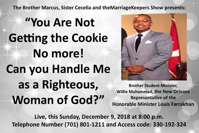 www.facebook.com/events/1927466904009981 God willing, this Sunday, December 9, 2018, at 8:00 p.m. EST., please join us as we welcome Brother Student Minister, Willie Muhammad, the New Orleans, Louisiana Representative of the Honorable Minister Louis Farrakhan and your Marriage and Relationship Servants, Brother Marcus, Sister Cecelia, and TheMarriageKeepers! We are going to thoroughly discuss, “You are not getting the cookie no more! Can You Handle Me as a Righteous Woman of God?”