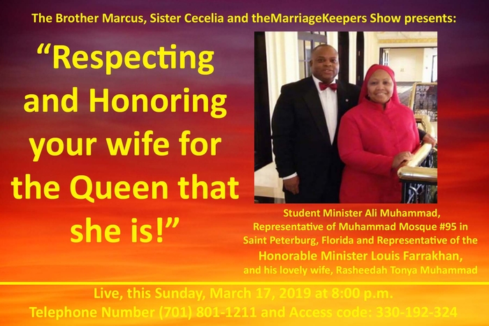 God willing, this Sunday, March 17, 2019, at 8:00 p.m. EST., please join theMarriageKeepers as we welcome Brother Student Minister Ali Muhammad, Representative of Muhammad Mosque #95 in Saint Petersburg, Florida and Representative of the Honorable Minister Louis Farrakhan, and his lovely wife, Rasheedah Tonya Muhammad! They are going to share insight and wisdom on the topic, “Respecting and Honoring your wife for the Queen that she is!”