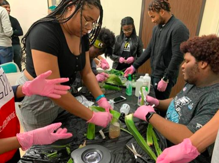 Using aloe plants from Oakwood Farms and isopropyl alcohol, along with a couple other additives, they made two batches of bacteria-killing hand sanitizers, one at 68% alcohol and one at 84%. Sanitizer was given to the Oakwood University Child Development Lab, and the other bottle was used by students in the classes and laboratories in the Chemistry Department.